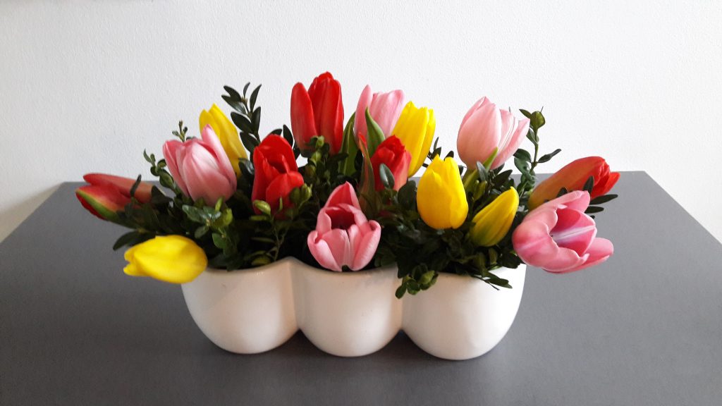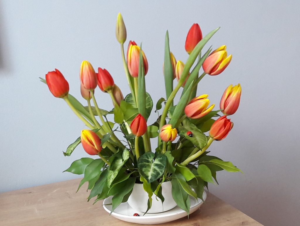 - Bukiet, dekoracja – radośnie, czerwone i czerwono-żółte tulipany w otoczeniu roślin domowych. Biedronki na szczęście, w prezencie. Bouquet, decoration – joyfully, red and red-yellow tulips surrounded by house plants. Ladybirds as a symbol of a happiness, as a gift.