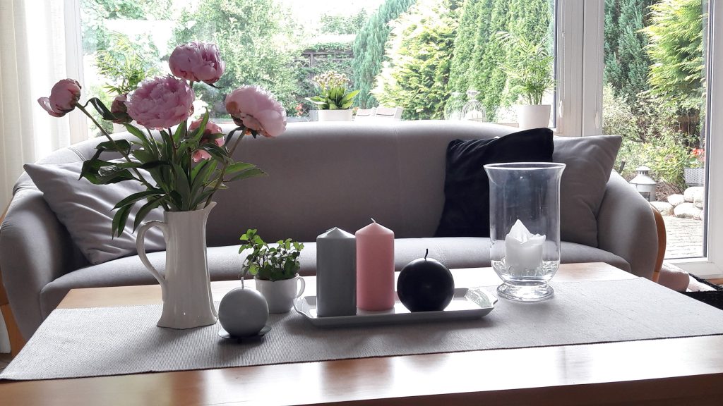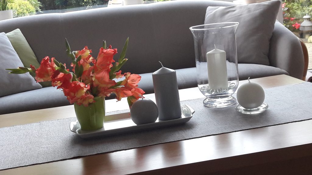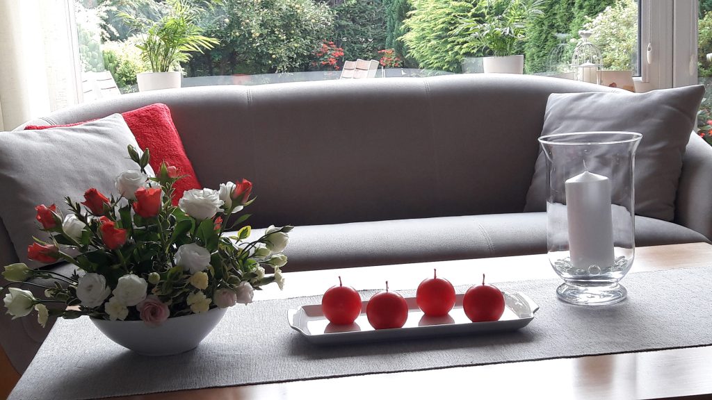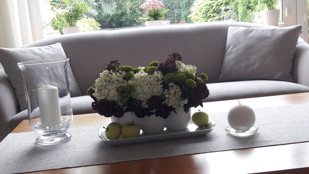 - Na stoliku kawowym – kwiaty z ogrodu i „papierówki”.