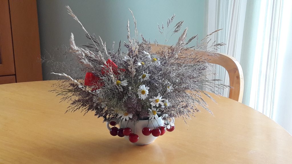 - Letnia fantazja – bukiet z rumianków i traw, z wiśniami.