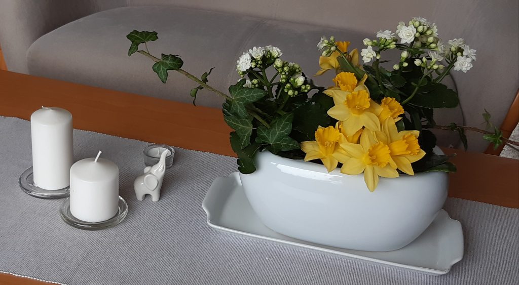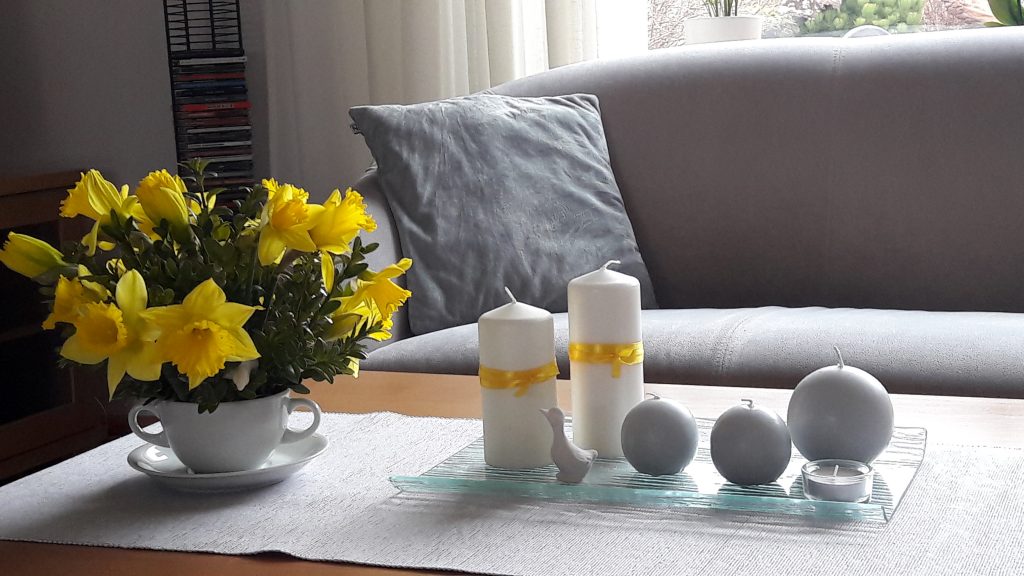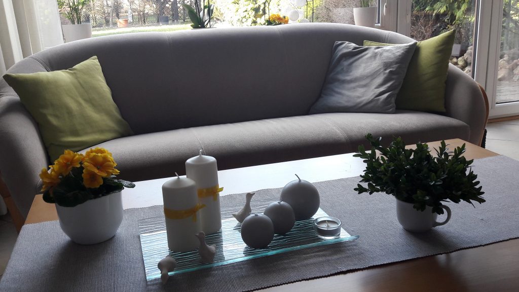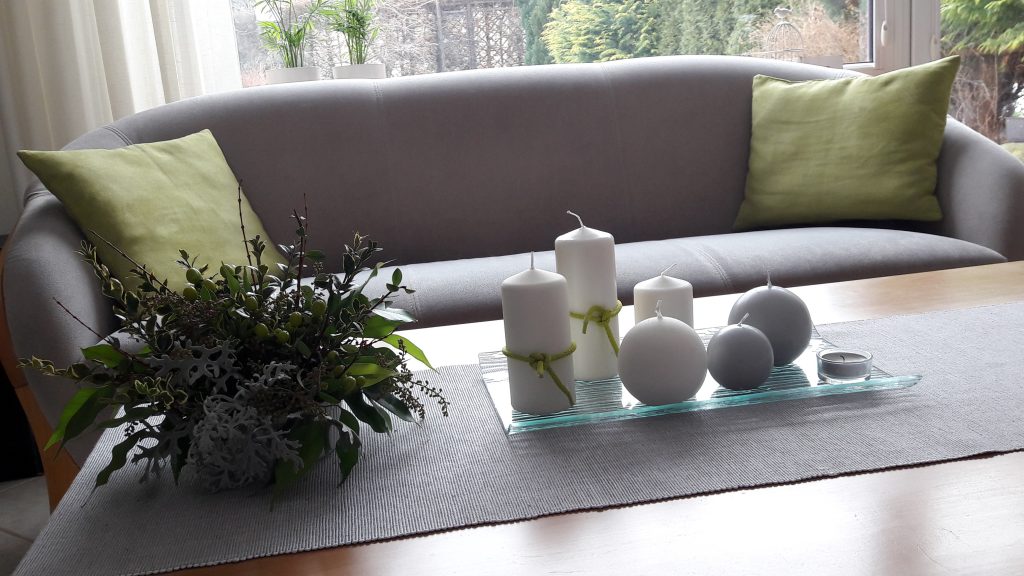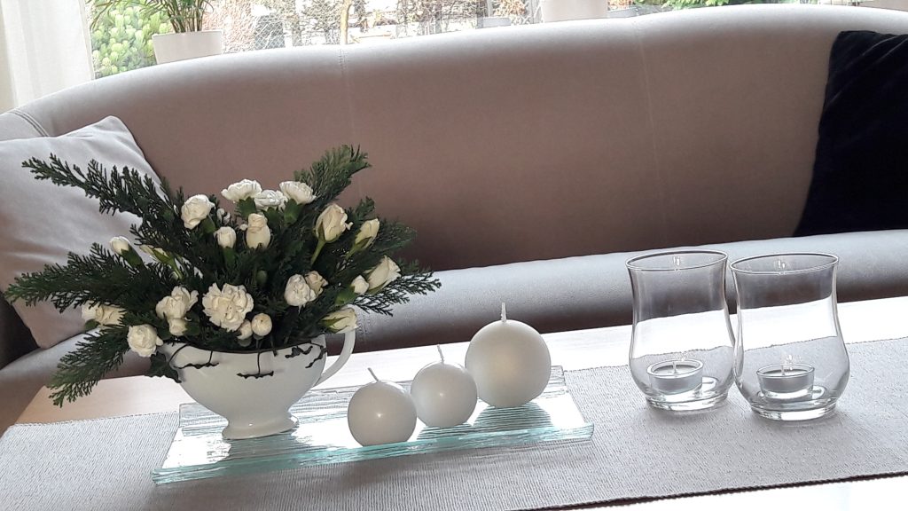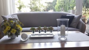- Dekoracja na stoliku do kawy – biały, szary, zielony. Luty, jeszcze zima w przyrodzie, a w domu odrobina wiosny.
