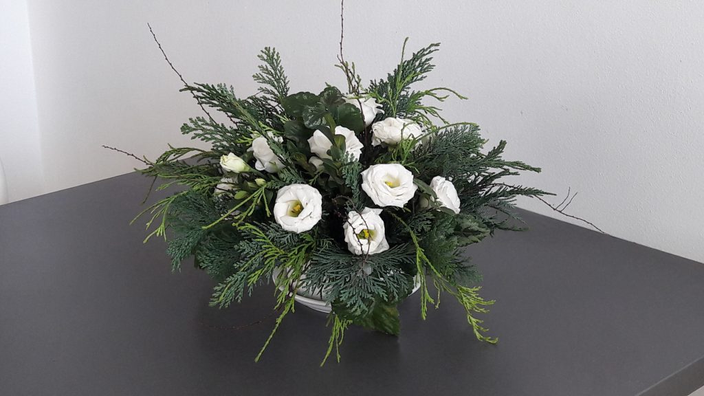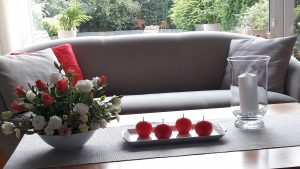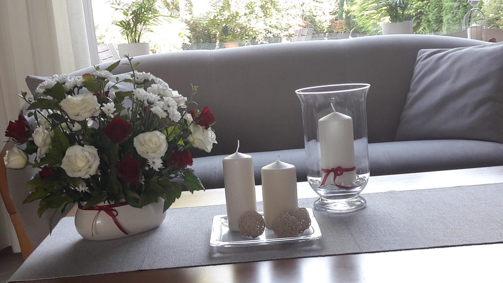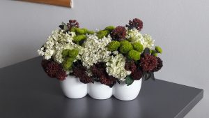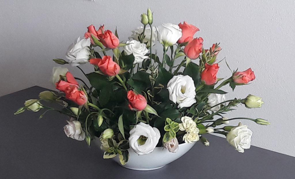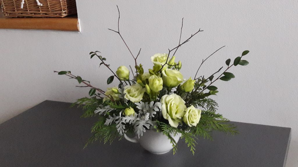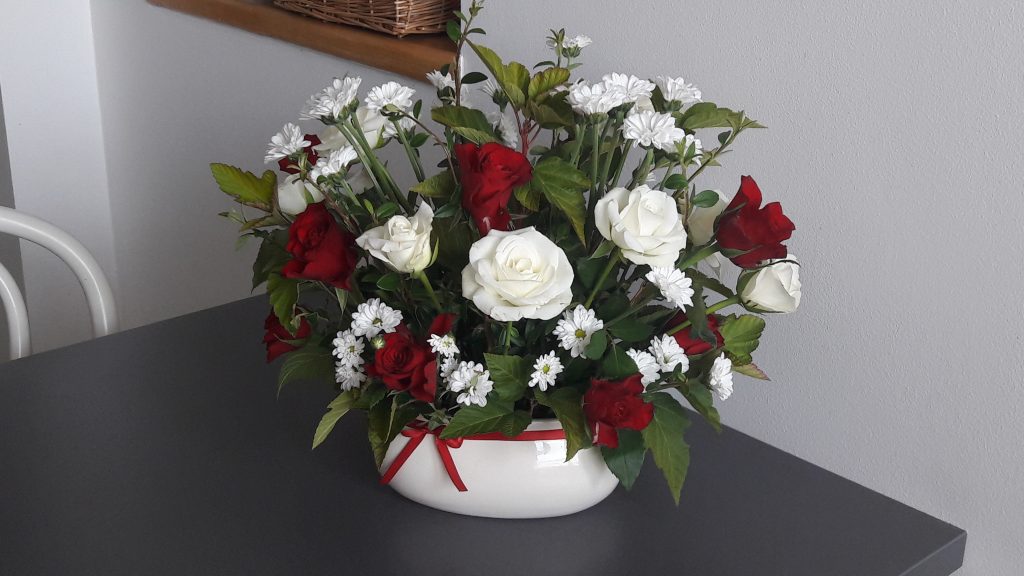 - Kompozycja – na stoliku do kawy. Bukiet – bordowe róże. Trzy kolory – biały, bordowy, zielony.