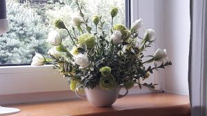 - Bukiet – zielono-biała eustoma i to co w ogrodzie o tej porze roku. Niewielki, w prezencie.