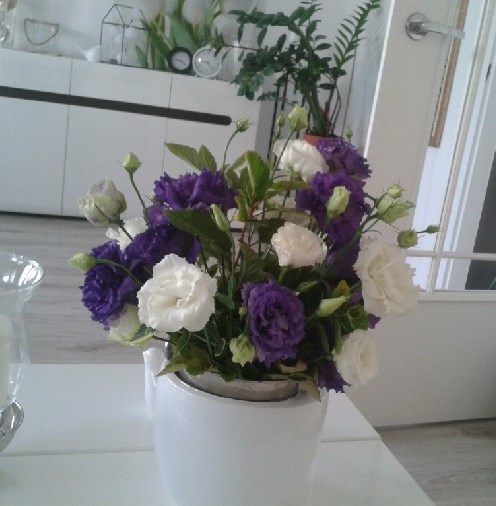 - Biała i fioletowa eustoma w pięknym wnętrzu.