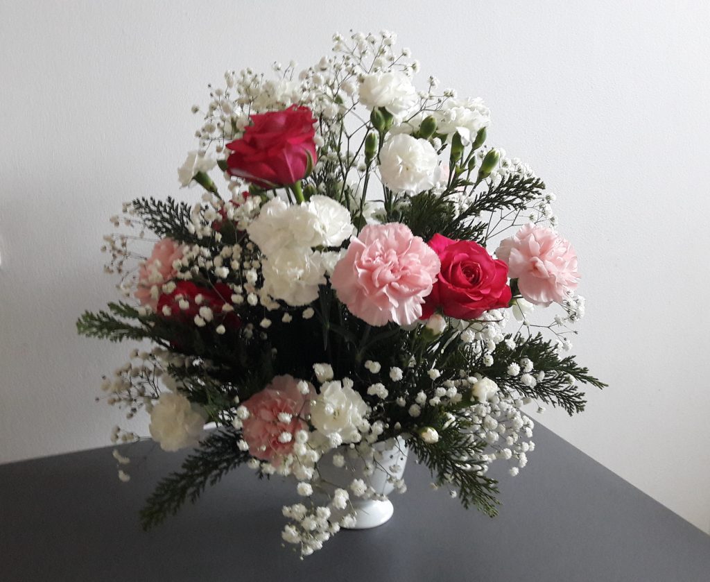 - Bukiet – kompozycja z goździkami i różami, w prezencie.