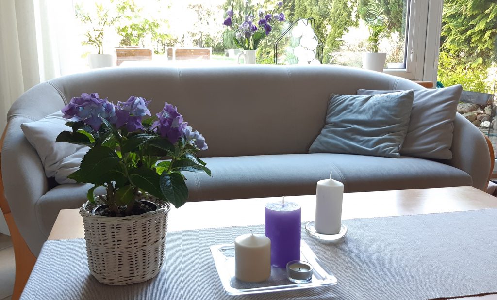 - Stolik do kawy z fioletową hortensją – szary, biały, fioletowy w otoczeniu zieleni, zawsze pięknie. Coffee table with violet hydrangea – gray, white, purple surrounded by greenery, always beautiful.